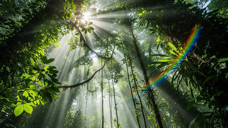 Sunbeams pierce through a dense rainforest canopy, creating a magical display of light rays and a vibrant rainbow effect in the misty air.