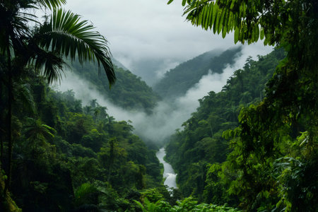 Rainforest valley with green trees and river winding through, surrounded by mist and dense clouds. Vibrant natural environment