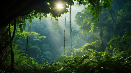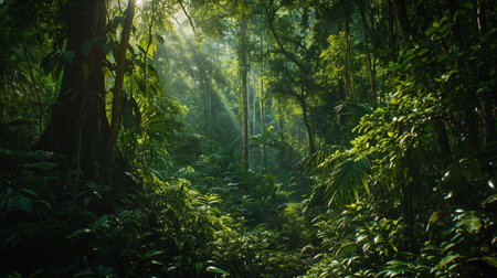 A captivating scene of a tropical rainforest featuring tall trees and vibrant green foliage. Sunlight filters through, casting a serene atmosphere in this natural sanctuary.