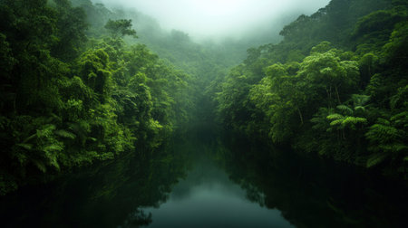 Lush green rainforest reflecting on still water under a misty atmosphere.
