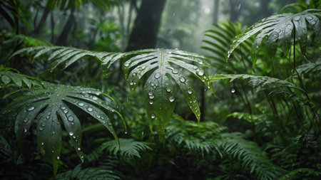 Experience the serene beauty of a lush green forest landscape shrouded in mist, showcasing the vibrant diversity of tropical flora in a tranquil setting.