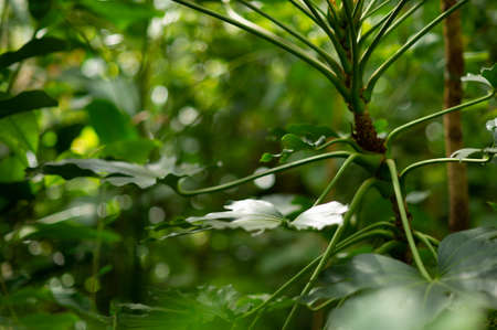 Closeup nature view of green leaf and flower in forest at summer under sunlight.