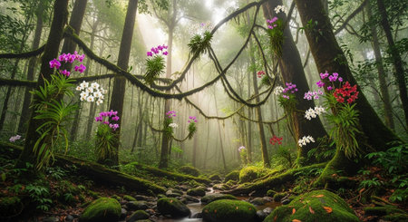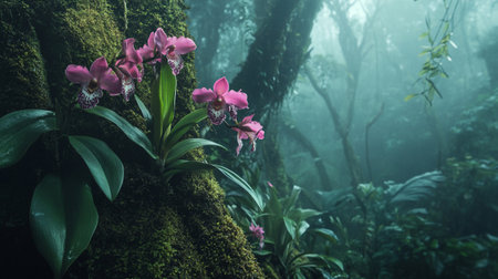 Explore the serene beauty of a lush tropical rainforest filled with vibrant orchids and rich green foliage, showcasing nature's diversity.