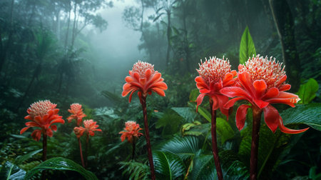 A vibrant red ginger flower standing tall amidst lush foliage in a tropical rainforest.