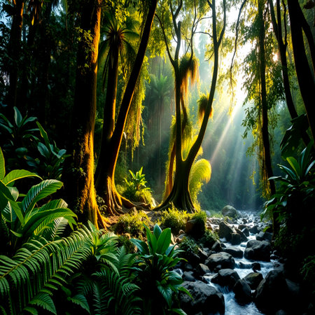 A tranquil river in a lush rainforest at dawn. Golden sunlight filters through the trees, creating a serene and peaceful atmosphere.