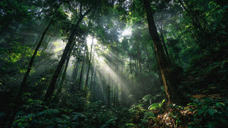 Sun rays pierce through the dense green canopy of a tropical rainforest, illuminating the misty air with dramatic light beams. A serene and natural forest scene.