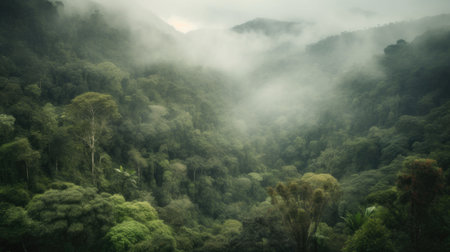 Fog slowly rising above lush green tropical rainforest creating a mysterious and evocative atmosphere. Ai generated image