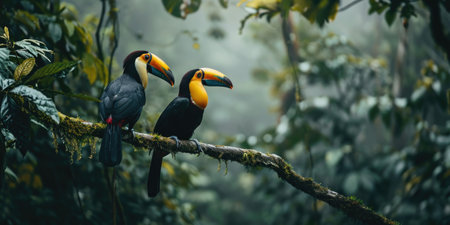 two toucan birds perched on a tree branch in a jungle, in the style of bold chromaticity.