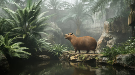 A capybara stands gracefully near a serene pond amidst lush tropical foliage. This tranquil scene highlights the beauty of wildlife in its natural habitat, showcasing the vibrant greenery and calm water. Perfect for nature lovers and wildlife enthusiasts.