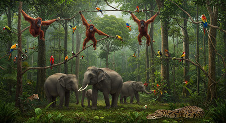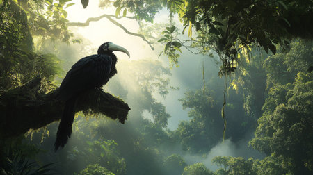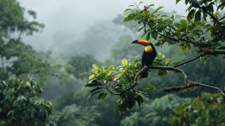 Rainforest with a fog concept, a luxuriant, dense forest rich in biodiversity, found typically in tropical areas with consistently heavy rainfall