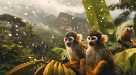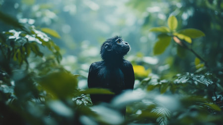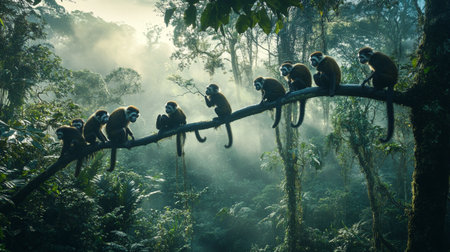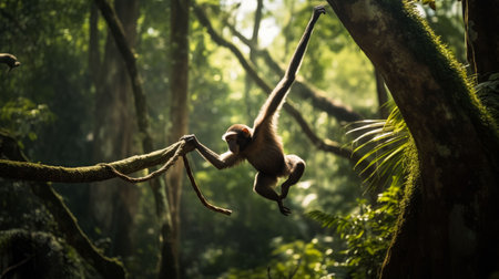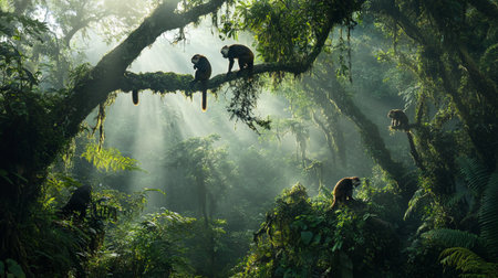A young monkey sits on a tree branch in a lush tropical forest, curiously gazing ahead. The warm sunlight filters through the leaves, creating a serene and magical atmosphere.