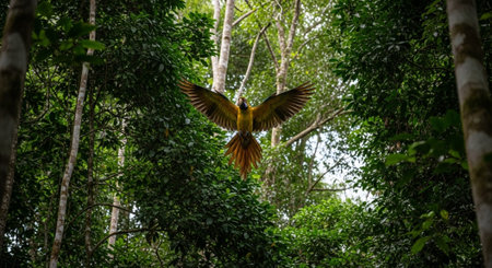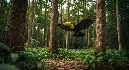 A Colorful Keel-billed Toucan Soaring Through a Lush Rainforest
