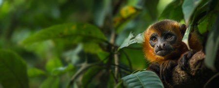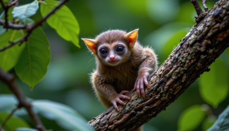 Adorable small monkey with big eyes perched on a tree branch in lush green foliage, capturing the essence of wildlife and nature in a vibrant environment