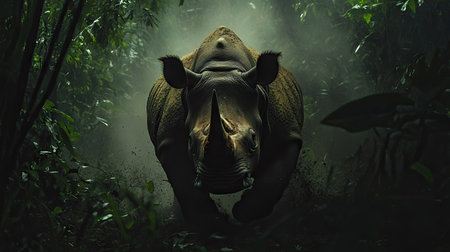 A critically endangered Javan rhinoceros moving through the dense Indonesian jungle, its thick skin and distinctive horn creating a dramatic silhouette.