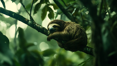 A sloth peacefully resting on a tree branch in the rainforest showcasing wildlife's serene moments.