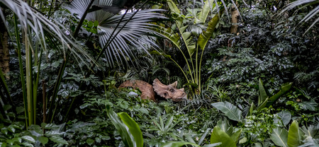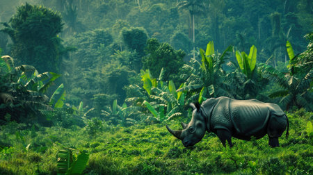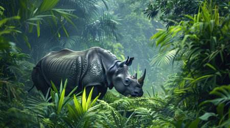 A panoramic shot of a Javan rhino in its forest habitat, highlighting the biodiversity of Ujung Kulon National Park.