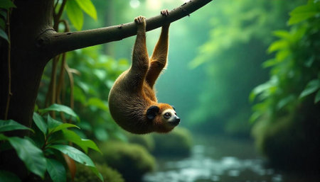 Sloth Hanging Upside Down From Tree Branch in Jungle