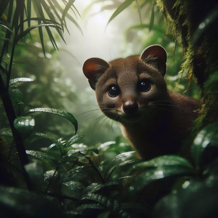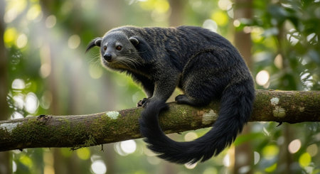 Sunlight filters through the lush foliage, illuminating a small marsupial as it explores a tree branch. Its fur glistens, showcasing nature's beauty in this vibrant forest setting.