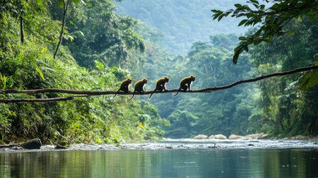 A spider monkey family crossing a river via overhead branches in a serene Colombian rainforest