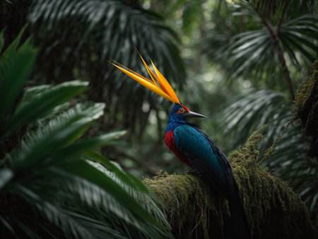 Exotic tropical flowers, vibrant red and orange heliconias surrounded by lush green foliage generative ai