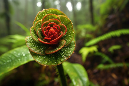 spiral ginger flower with dewdrops in a rainforest, created with generative ai
