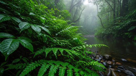 A dense forest scene showcases lush green vegetation with a calm water stream meandering through. The image is characterized by vibrant green foliage, diffused lighting, and a foggy atmosphere. The composition emphasizes depth, suitable for environmental projects, nature illustrations, or commercial applications. The scene provides a sense of tranquility and untouched nature.