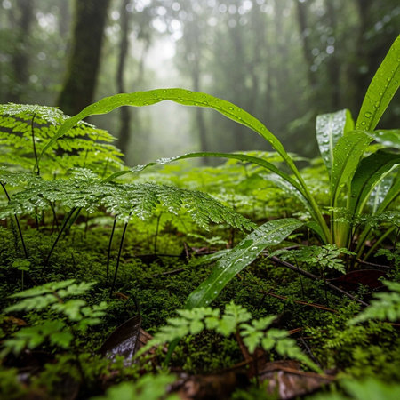 Explore the rich textures and vibrant greenery of fern leaves adorned with raindrops, creating a misty and refreshing tropical atmosphere.