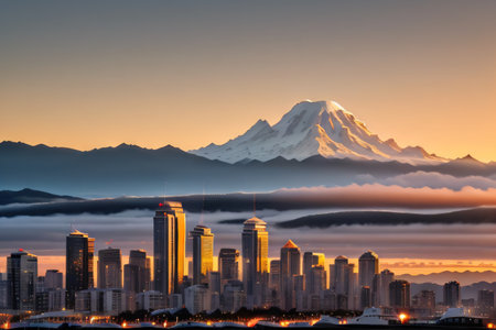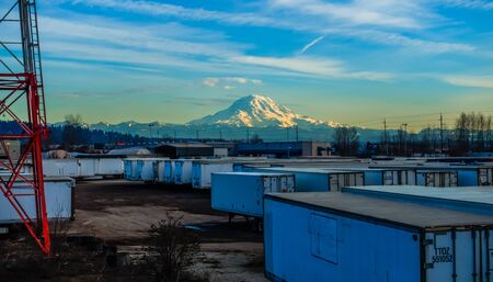 A landscape view of Mount Rainier from Burien, Washington in the fall.