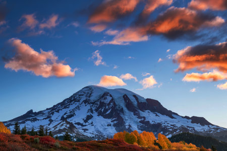A stunning view of Mount Rainier, partially snow-capped, during sunset. Autumn foliage in vibrant reds and yellows adorns the foreground.