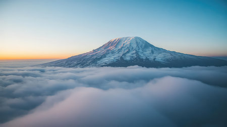 An enchanting view of a majestic snow-capped mountain peak rising above soft clouds at sunrise. The vibrant colors of the sky create a serene atmosphere.