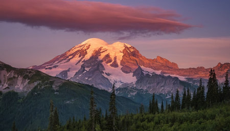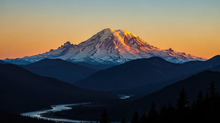 Mount Rainier at sunset, Washington State, USA. Mount Rainier is the highest mountain in the United States.