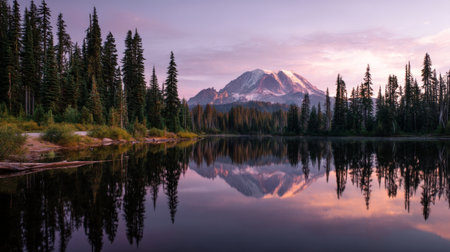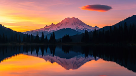 Stunning golden hour view of mount rainier surrounded by forest and reflecting lake below