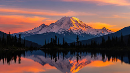 Mount Rainier at sunset with reflection in the lake, Washington. generative ai