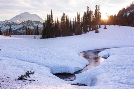 Mount Rainier at sunrise in Mount Rainier National Park about 59 miles south-southeast of Seattle USA