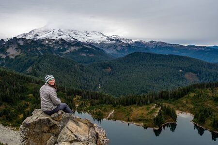 Woman Sits on Outcropping from Tolmie Peak with glassy Eunice Lake