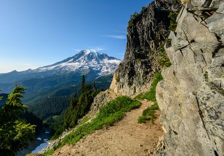 Empty Trail Toward Mt Rainier cuts along cliff edge