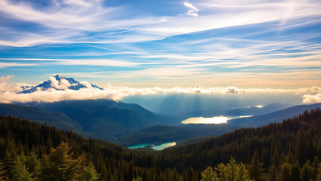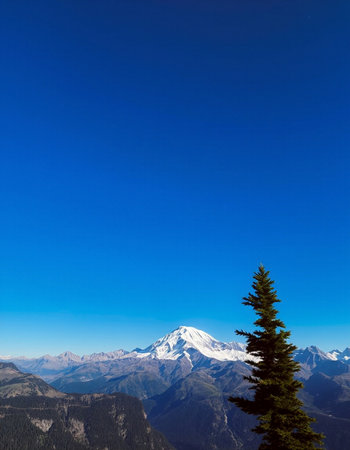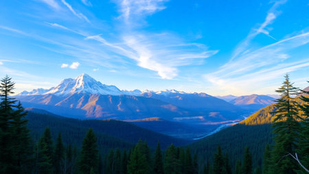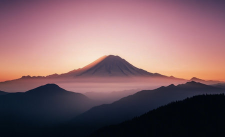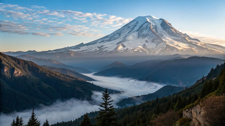 Majestic mountain peak rising above a valley shrouded in morning mist. Vast, snow-capped summit against a clear, vibrant sky. Green forested slopes and valleys