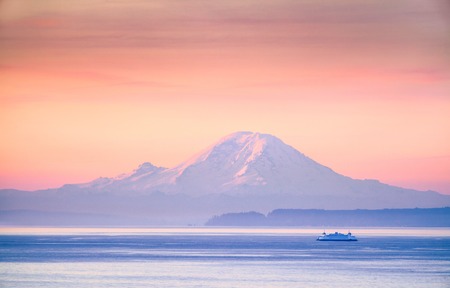 A ferry crossing the Puget Sound at sunrise with Mount Rainier in the background, Washington, USA
