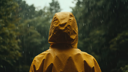 A person wearing a yellow rain jacket stands in the pouring rain, facing a lush green forest. The scene captures a tranquil yet adventurous mood.