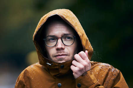 Heavy rain during autumn day. Portrait of young man in waterproof jacket.