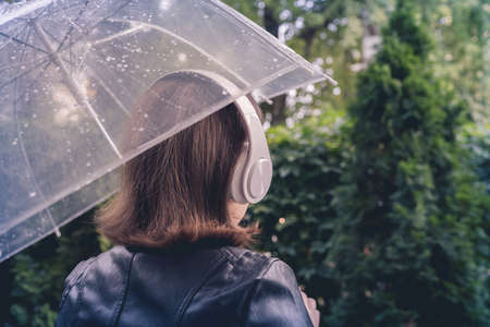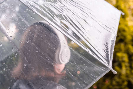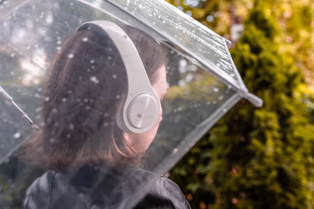 Autumn. Lonely sad woman in a headphones walking in a park, garden. View through wet transparent umbrella with rain drops. Rainy day landscape.