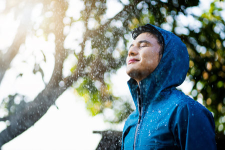 Handsome Asian guy standing in the rain outdoors. He wears a raincoat
