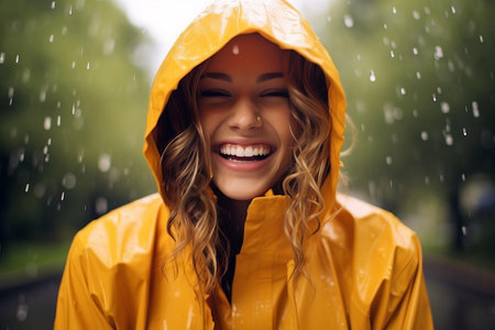 Happy young woman in yellow raincoat under rain
