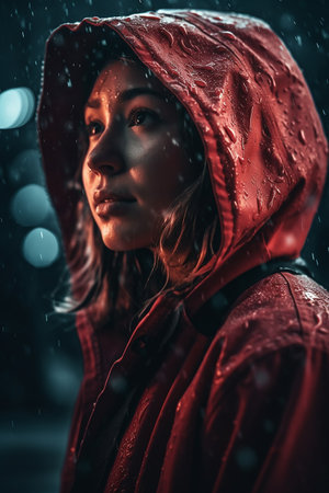 Portrait of a young woman in a red raincoat on a rainy day.