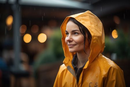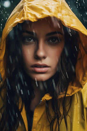 Woman in a Yellow Raincoat in Rain, close up portrait