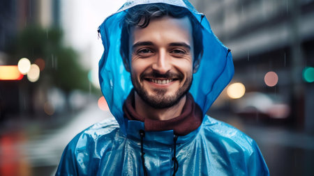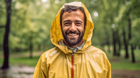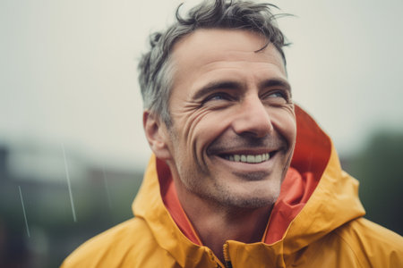 a happy portrait of a man wearing a raincoat. GENERATE AI