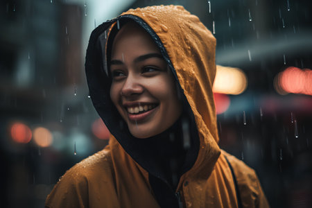 Portrait of a smiling young woman wearing raincoat standing in the rain.