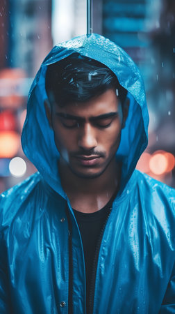 young handsome indian man in blue raincoat at night in city