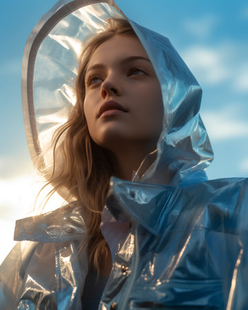 Portrait of a girl in a raincoat against the blue sky.