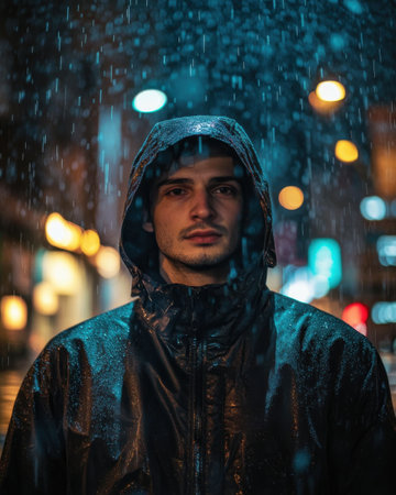 Rain cascades down as a young man gazes into the distance on a vibrant city street at night, dressed in a black waterproof jacket and surrounded by glowing lights.